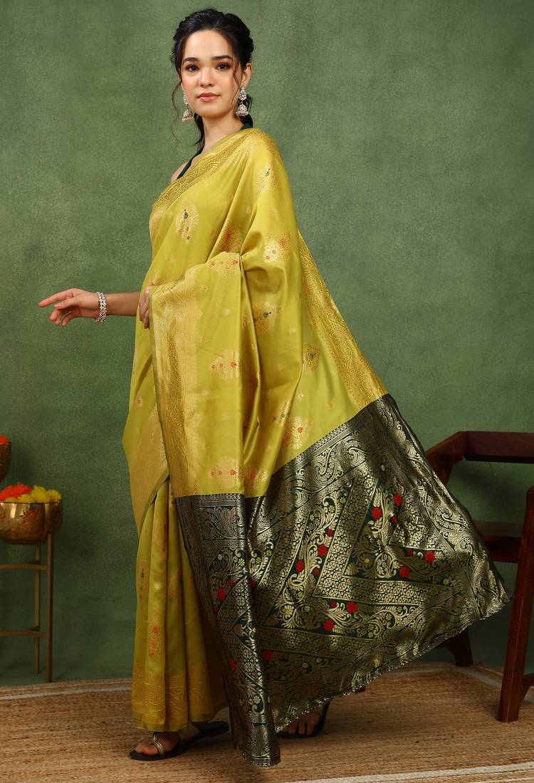 | • | Saree | : | Color- Yellow / Fabric- Silk |