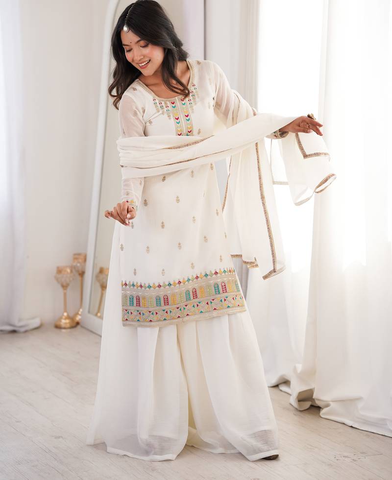 White color crunchy silk multi thread work party wear salwar suit stitched