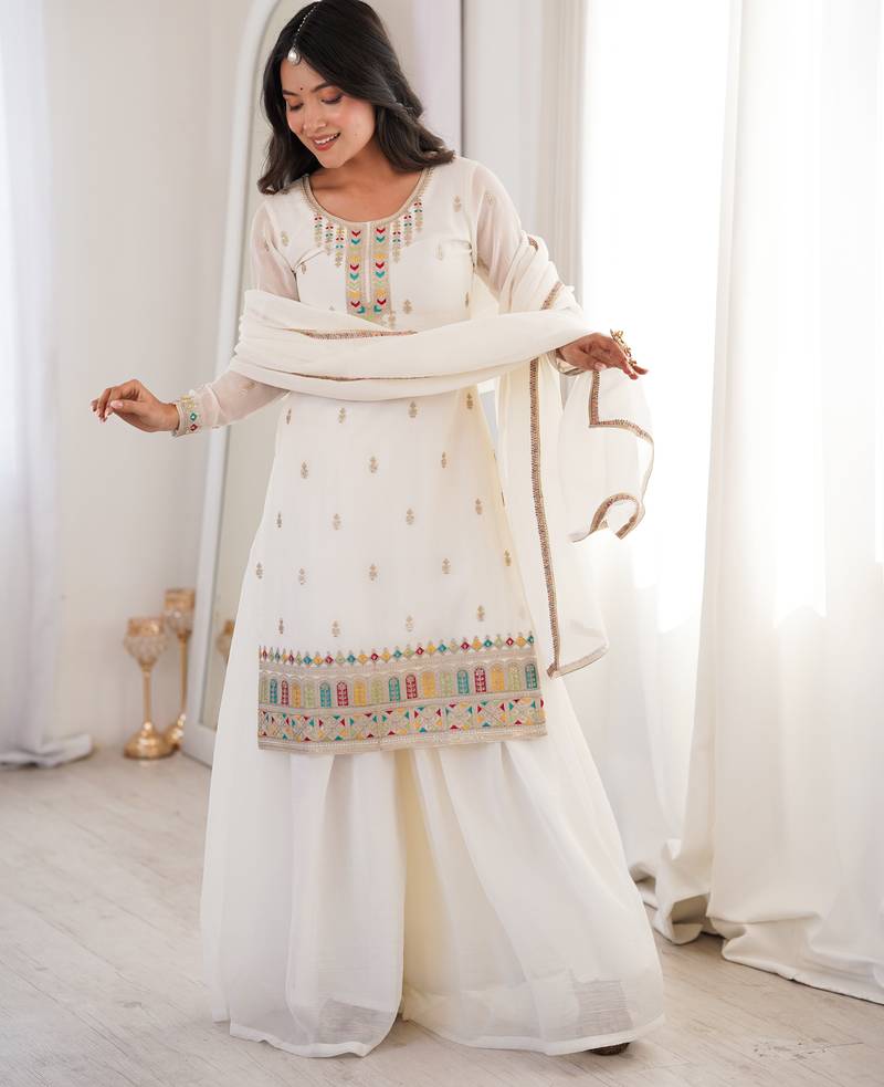 | • | Kameez | : | Color- White / Fabric- Faux Georgette |