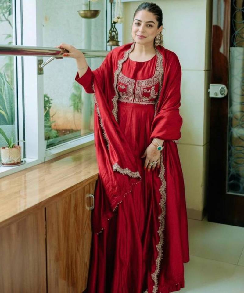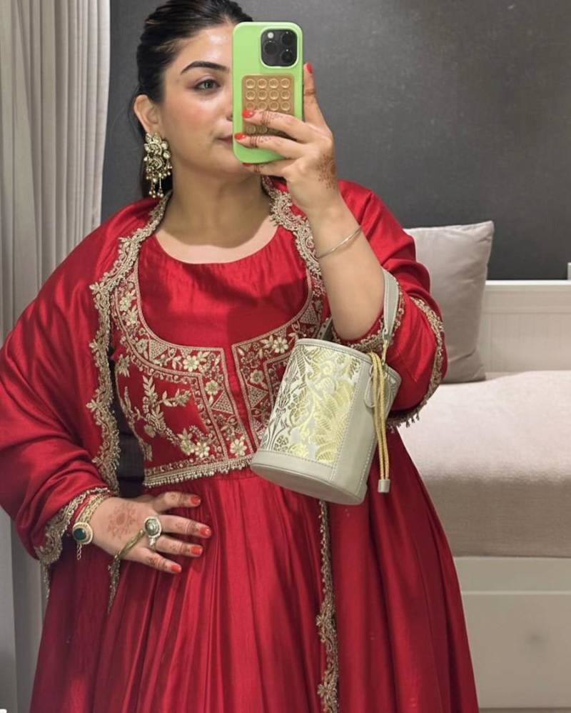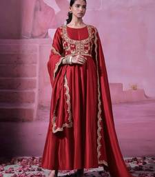 | Product Name | Maroon Chinnon Silk Solid Flared Gown With Sequins Embroidered Koti And Dupatta | |