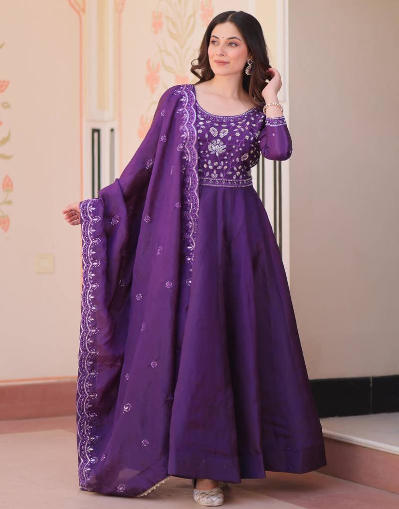 Purple gold crush beads embroidered work flared gown with heavy dupatta stitched