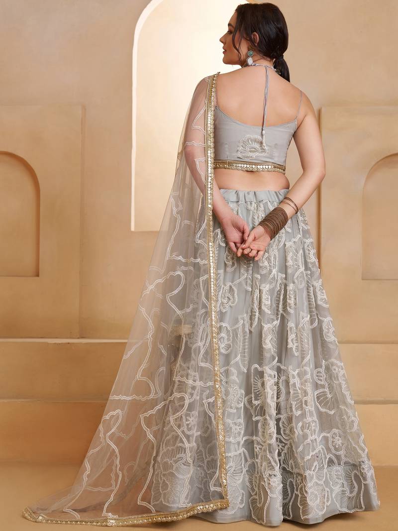 This Elegant Grey Lehenga Is Crafted From Delicate Net Fabric And Beautifully Decorated With Intricate Thread, Sequins, And Embroidery. The Flowing Silhouette With A Graceful 42 Inch Length Enhances The Outfit’s Charm, While The Detailed Floral Embroidery Adds A Luxurious, Festive Appeal.