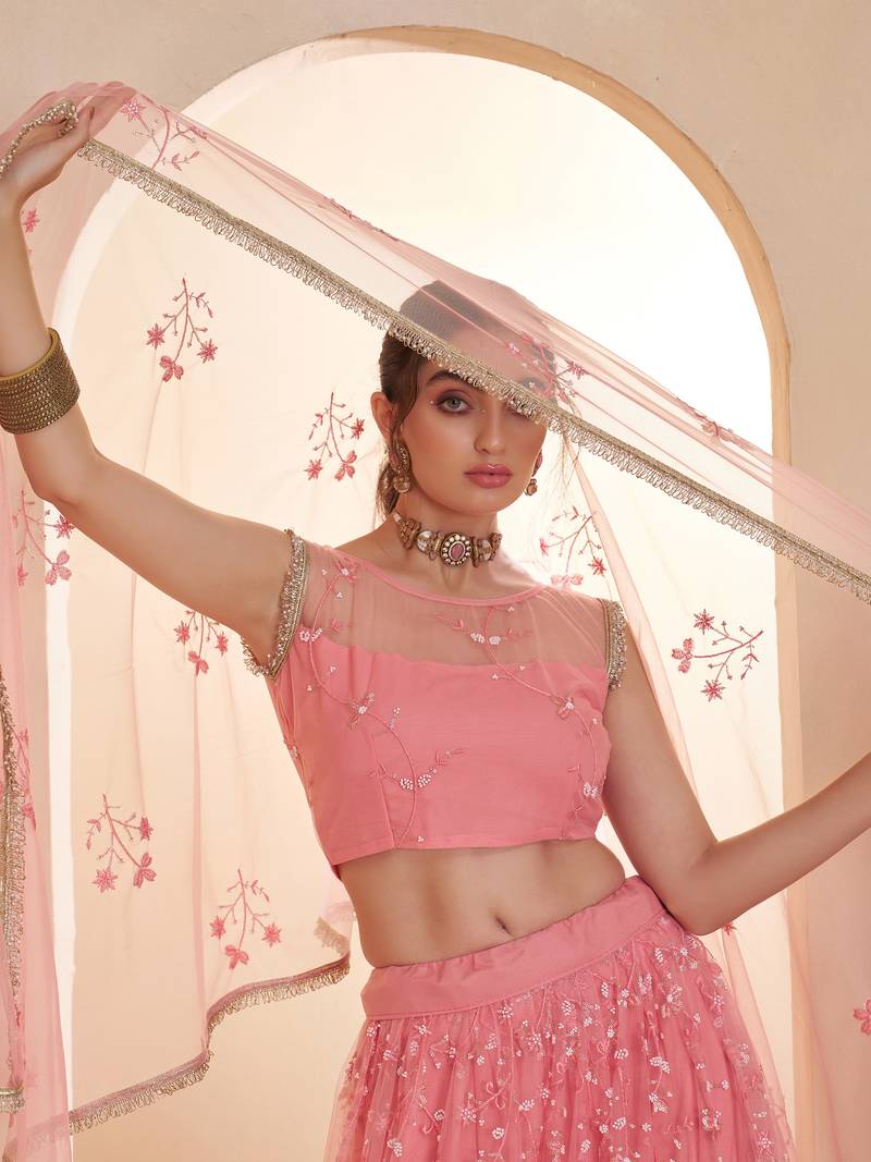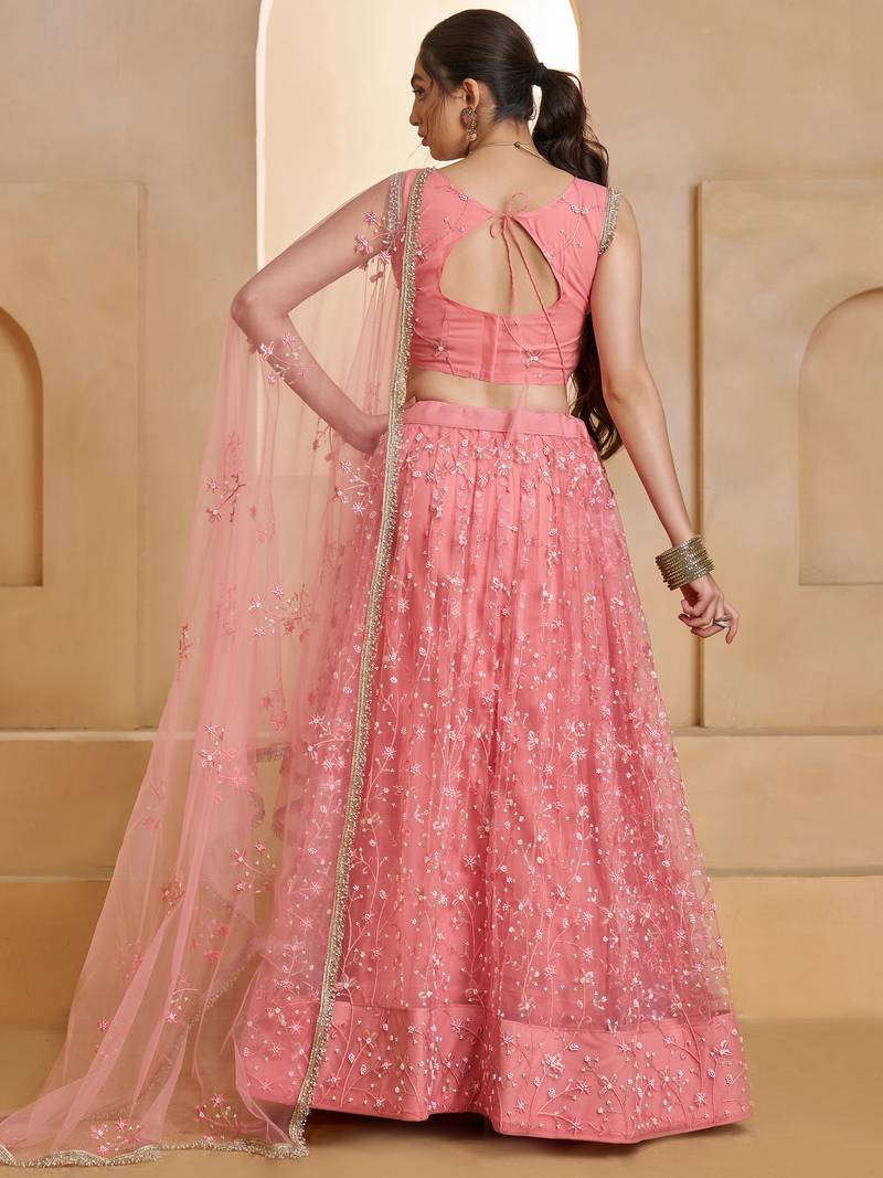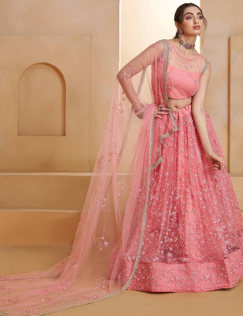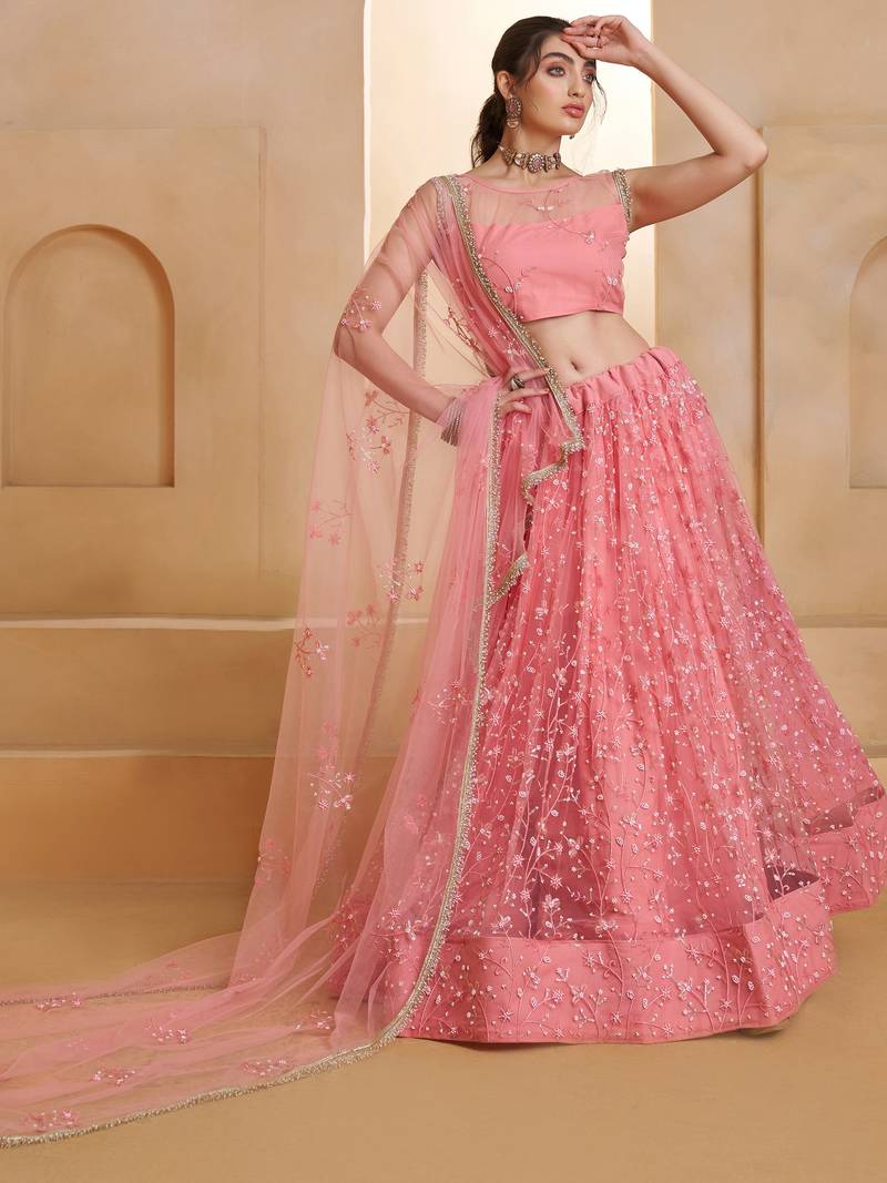 This Graceful Peach Pink Lehenga Is Crafted From Delicate Net Fabric And Beautifully Decorated With Intricate Thread And Sequin Work Embroidery. The Elegant Floral Patterns Spread Across The Lehenga Create A Rich, Festive Look, While The Flowing 42 Inch Length Enhances Its Stylish And Graceful Silhouette.