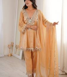 Available In Sizes M To Xxl, The Top Length Is 32 Inches With Full Sleeves And Cotton Inner Lining. The Pant Length Is 40–41 Inches With An Elastic Waist, And The Dupatta Length Is 2.3 Meters, Ideal For Festive Gatherings And Traditional Occasions.