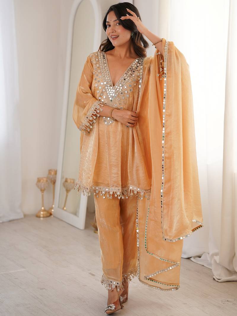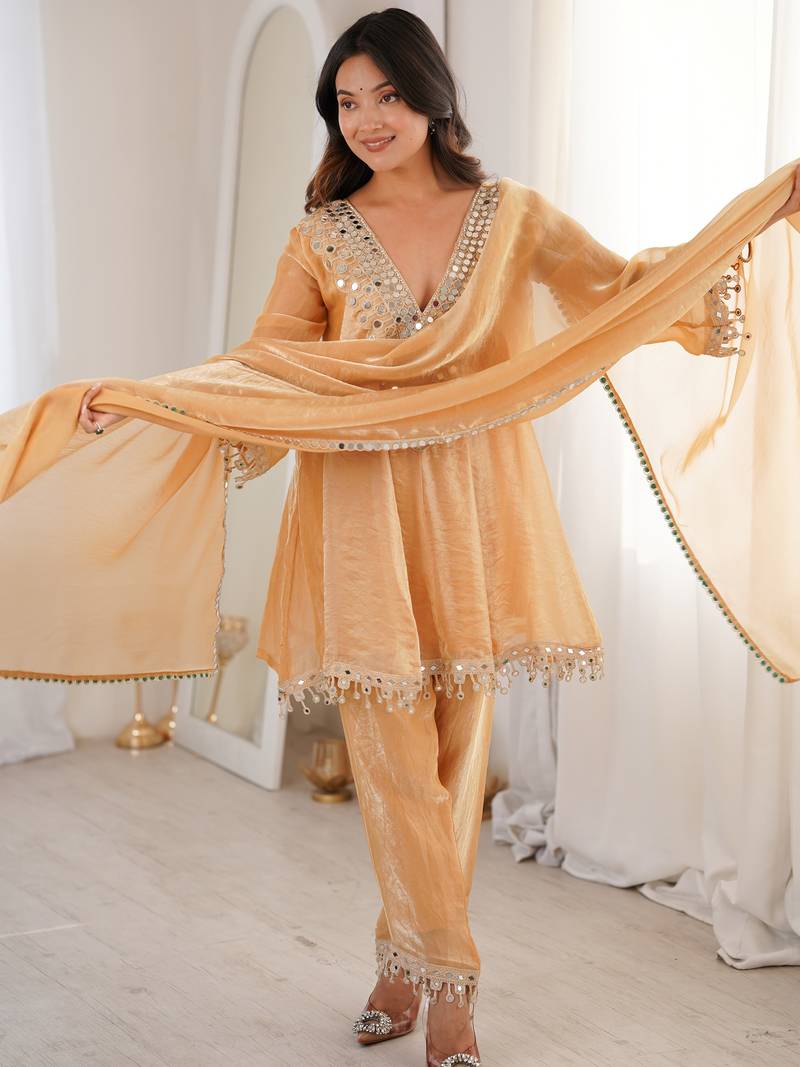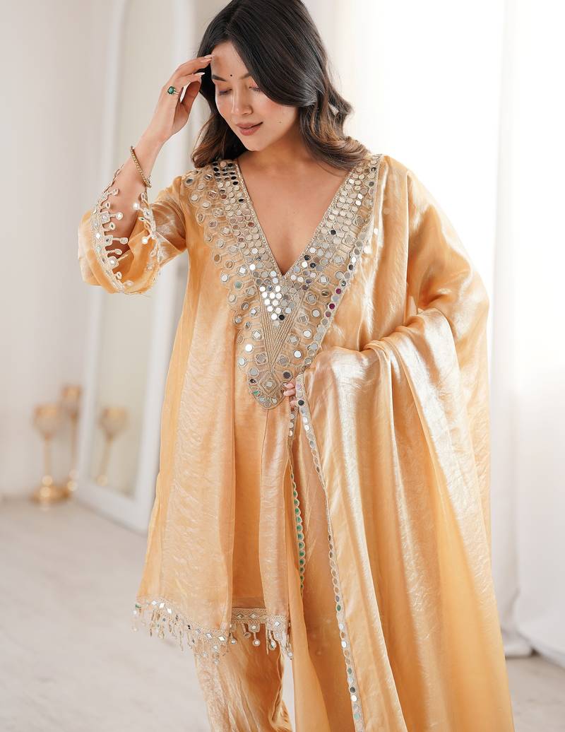 Elegantly Coordinated, The Pant Is Designed In The Same Chiku Beige Color, Featuring Delicate Mirror And Embroidered Lace Detailing Near The Hem That Blends Perfectly With The Top’s Embellishments For A Refined Look.