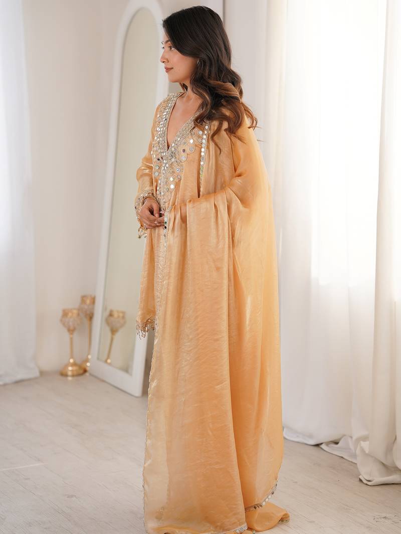 Completing The Ensemble, The Dupatta Carries A Flowing Chiku Beige Tone Enhanced With Rich Mirror And Coding Lace Work Along The Borders. The Shimmering Mirror Accents Add A Graceful Sparkle While Maintaining The Soft Neutral Palette.