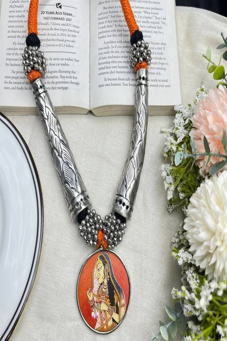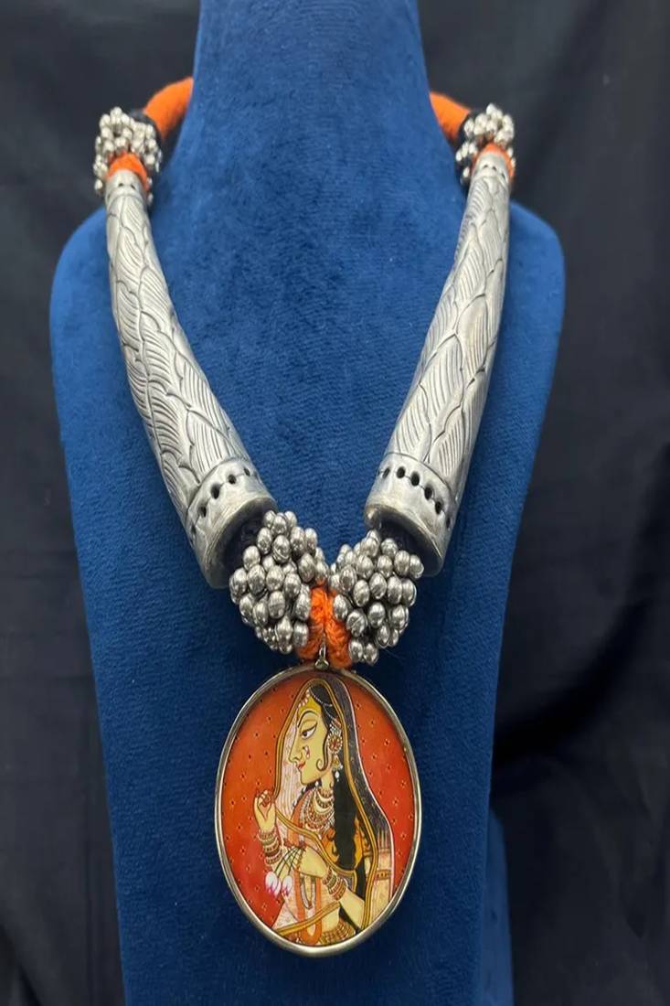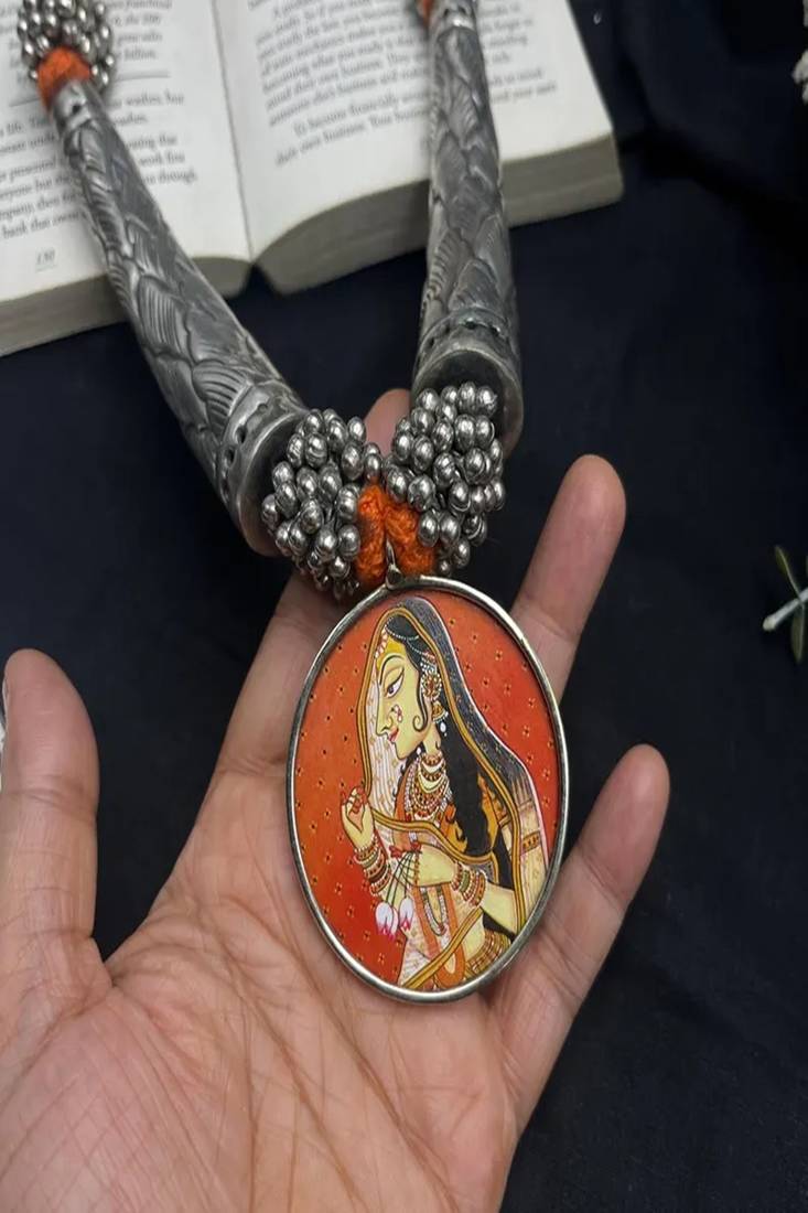 | Product Name | Heritage Tribal Indian Art Pendant Necklace Rajasthani Miniature Painting Jewelry|Oxidized Silver Hasli Chitai Necklace | |