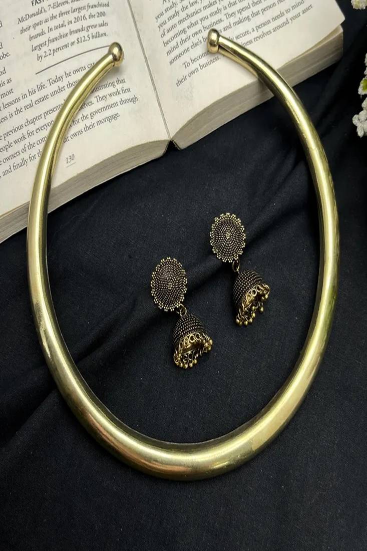 | Product Name | Oxidised Gold Brass Hasli Choker Necklace Set With Jhumka |Tribal Indian Boho Statement Torque Collar Necklace | |