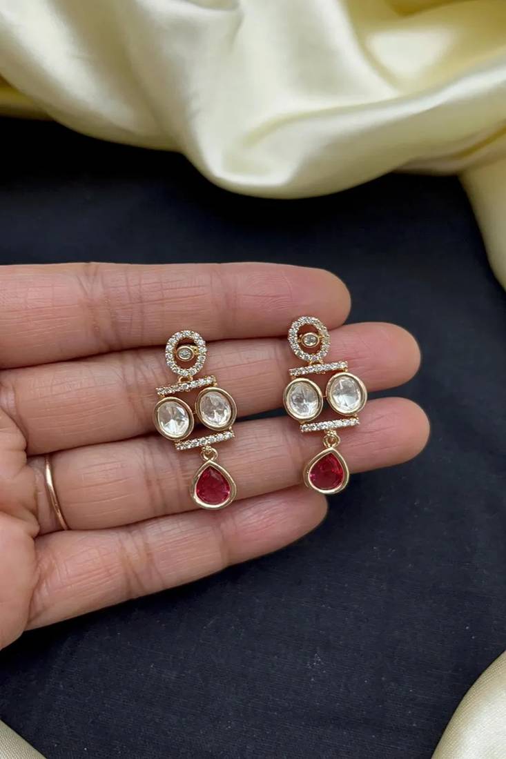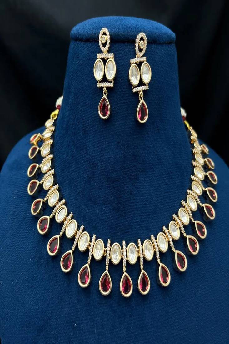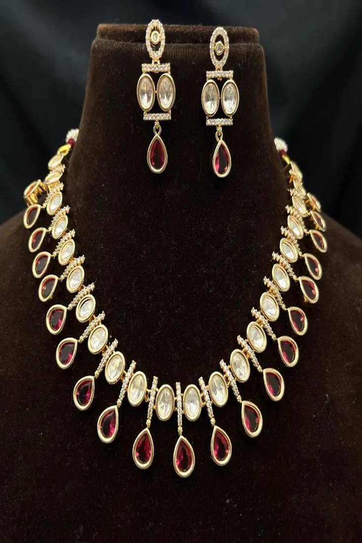 Elevate Your Ethnic Look With This Exquisite Polki Kundan Ruby Necklace Set, A Timeless Piece Inspired By Royal Indian Bridal Jewelry. Designed With Uncut Polki Stones And Rich Ruby Colored Accents, This Elegant Gold Plated Choker Necklace With Matching Earrings Blends Traditional Craftsmanship With Modern Sophistication.