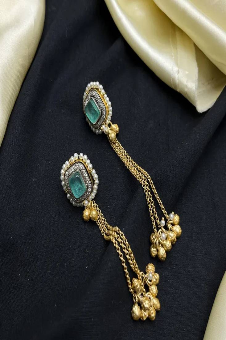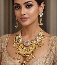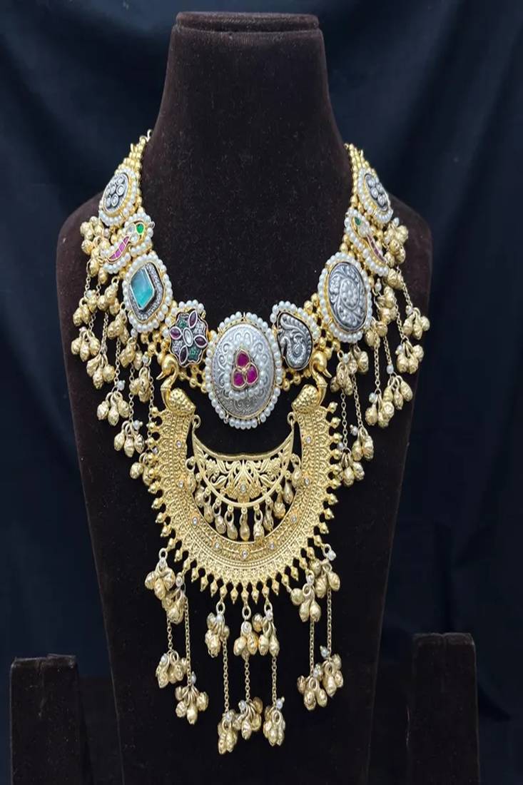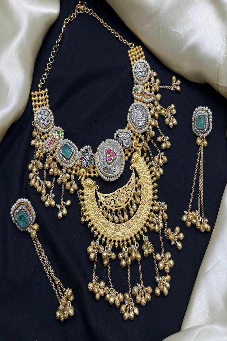 | Product Description | Make A Regal Statement With This Exquisite Rajwadi Heritage Kundan Necklace Set, Inspired By Traditional Indian Royal Jewelry. Designed With An Antique Dual Tone Finish, This Handcrafted Masterpiece Blends Gold And Oxidized Silver Tones For An Authentic Vintage Appeal.The Crescent Shaped Statement Pendant Features Intricate Kundan Craftsmanship, Detailed Embossing, Peacock Motifs, And Floral Artistry. Adorned With Emerald Green And Ruby Red Stones, Delicate Pearls, And Cascading Gold Beaded Danglers, This Set Captures Timeless Royal Elegance. |